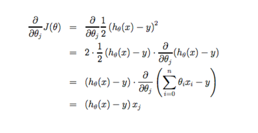 Note that we have separated out the two cases for\theta_jθjinto separate equations for\theta_0θ0and\theta_1θ1; and that for\theta_1θ1we are multiplyingx_{i}xiat the end due to the derivative.
