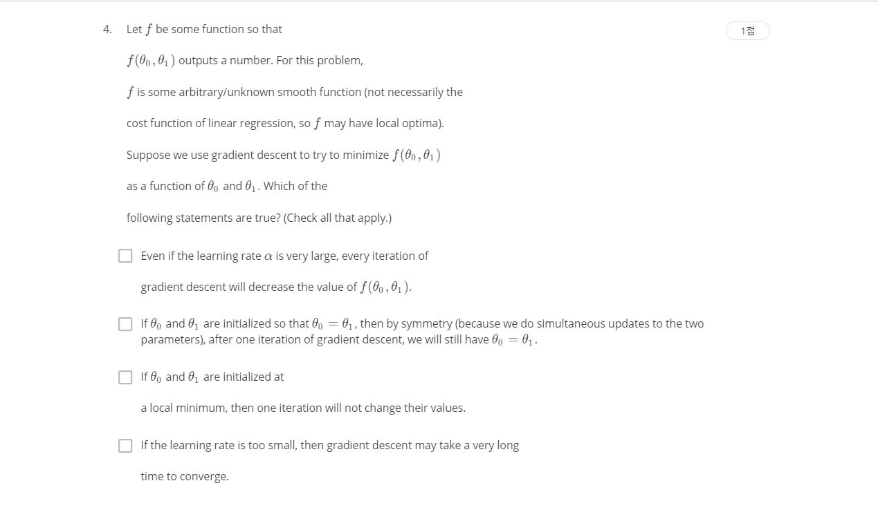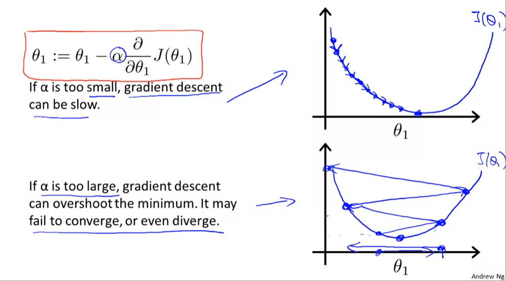 just to remind you this parameter, or this term alpha is called the learning rate. And it controls how big a step we take when updating my parameter theory j. 31초부터 동영상을 재생하고 스크립트 따르기0:31And this second term here is the derivative term 39초부터 동영상을 재생하고 스크립트 따르기0:39And what I wanna do in this video is give you that intuition about what each of these two terms is doing and why when put together, this entire update makes sense. In order to convey these intuitions, what I want to do is use a slightly simpler example, where we want to minimize the function of just one parameter. So say we have a cost function, j of just one parameter, theta one, like we did a few videos back, where theta one is a real number. So we can have one d plots, which are a little bit simpler to look at. Let's try to understand what gradient decent would do on this function.Alpha the the learning, is always a positive number. And, so we're going to take theta one is updated as theta one minus something. So I'm gonna end up moving theta one to the left. I'm gonna decrease theta one, and we can see this is the right thing to do cuz I actually wanna head in this direction. You know, to get me closer to the minimum over there.And so I have theta 1 minus a negative number which means I'm actually going to increase theta, because it's minus of a negative number, means I'm adding something to theta. And what that means is that I'm going to end up increasing theta until it's not here, and increase theta wish again seems like the thing I wanted to do to try to get me closer to the minimum.But if my learning is too big, I may take a huge step going from here all the way to out there. So we end up being over there, right? And if my is too big, we can take another huge step on the next elevation and kind of overshoot and overshoot and so on, until you already notice I'm actually getting further and further away from the minimum. So if alpha is to large, it can fail to converge or even diverge.