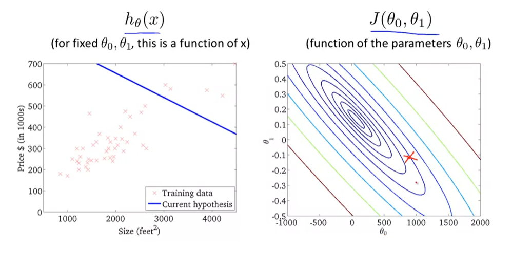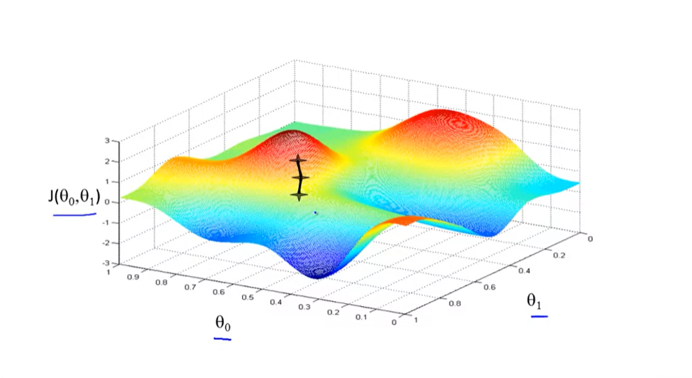 We put\theta_0θ0on the x axis and\theta_1θ1on the y axis, with the cost function on the vertical z axis. The points on our graph will be the result of the cost function using our hypothesis with those specific theta parameters.