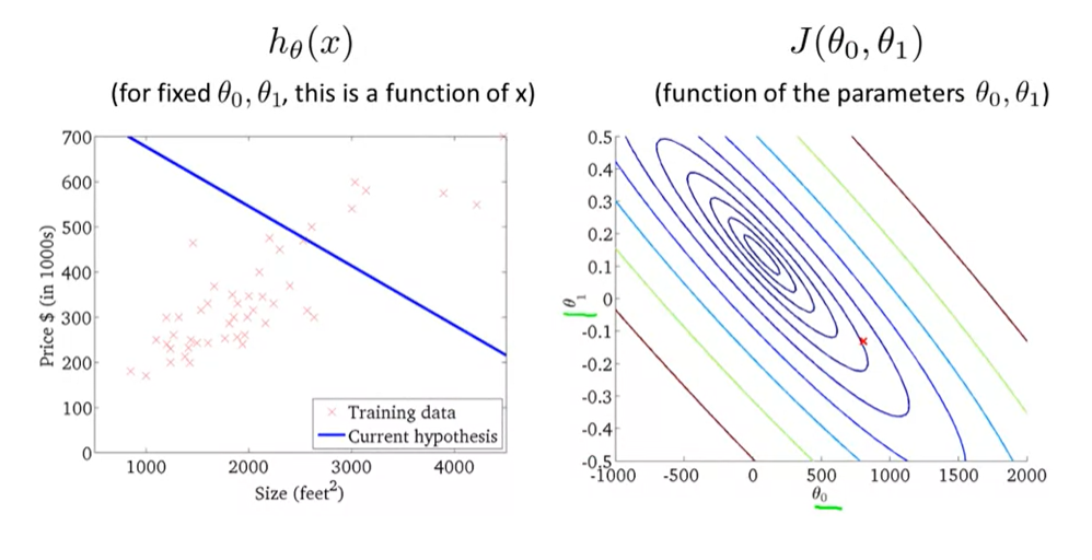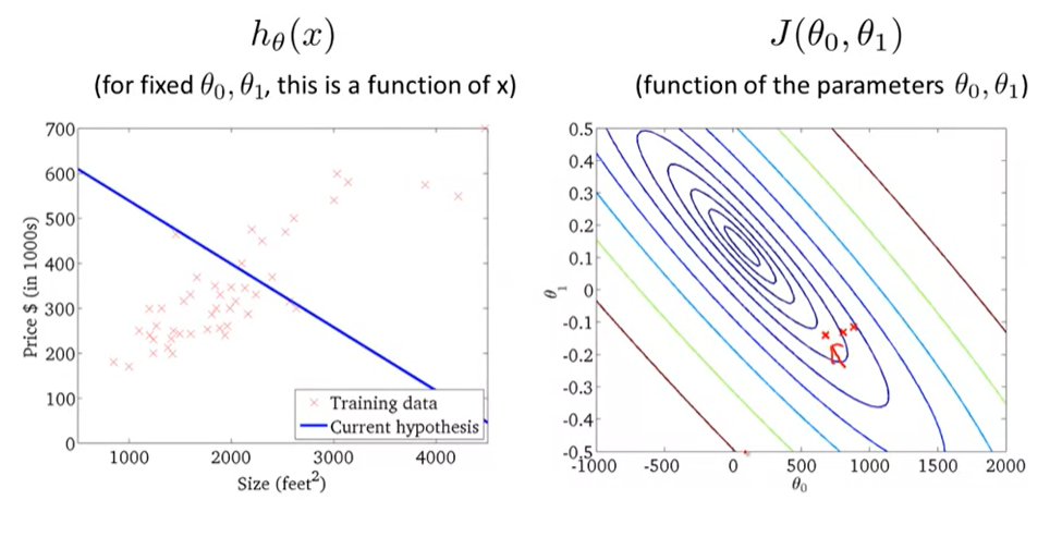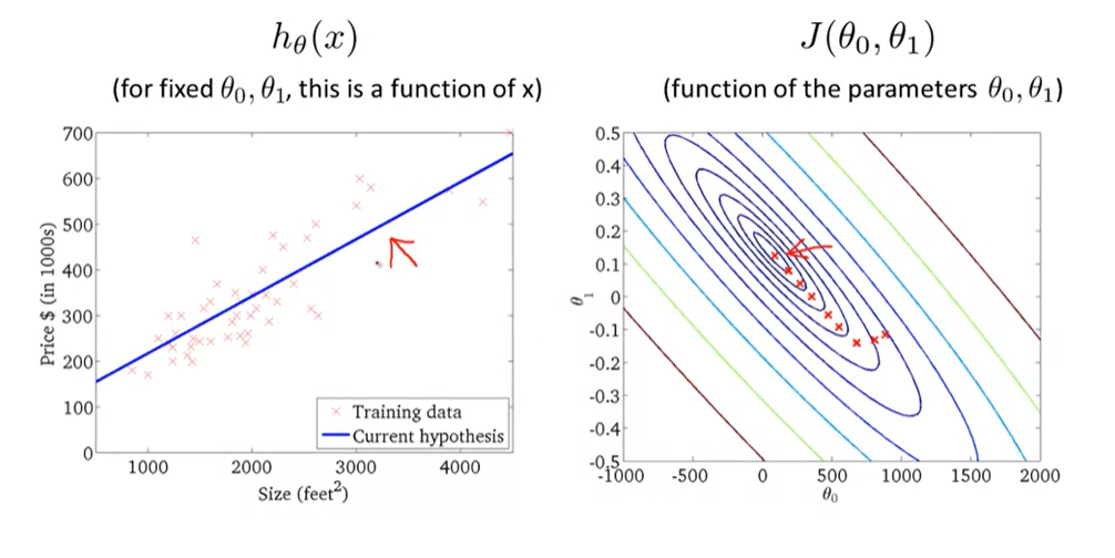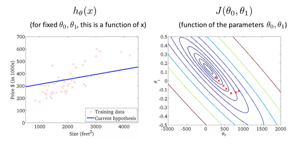 So we have our hypothesis function and we have a way of measuring how well it fits into the data. Now we need to estimate the parameters in hypothesis function. That's where gradient descent comes in.