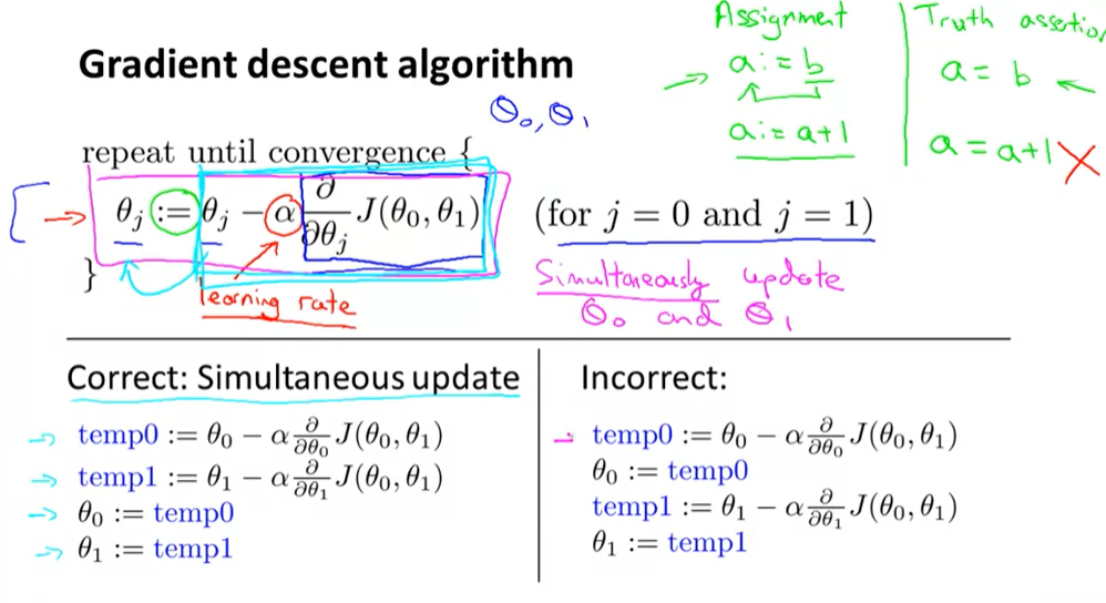 And then you keep going. From this new point you look around, decide what direction would take you downhill most quickly. Take another step, another step, and so on until you converge to this local minimum down here. .... Turns out, that if you're standing at that point on the hill, you look all around and you find that the best direction is to take a little step downhill is roughly that direction. Okay, and now you're at this new point on your hill. You're gonna, again, look all around and say what direction should I step in order to take a little baby step downhill? And if you do that and take another step, you take a step in that direction.Okay? So if I write a equals b, then I'll asserting that the value of a equals to the value of b, right? So the left hand side, that's the computer operation, where we set the value of a to a new value. The right hand side, this is asserting, I'm just making a claim that the values of a and b are the same, and so whereas you can write a := a + 1, that means increment a by 1, hopefully I won't ever write a = a + 1 because that's just wrong. a and a + 1 can never be equal to the same values. Okay? So this is first part of the definition. This alpha here is a number that is called the learning rate.