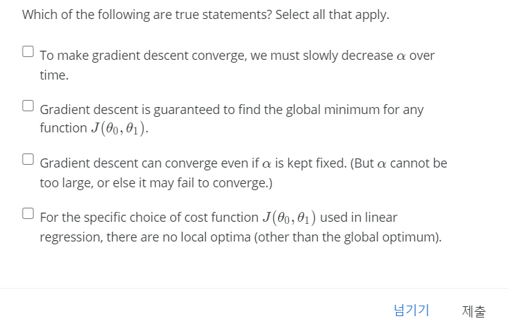 https://mangkyu.tistory.com/34 repeat until 수렴 we saw how depending on where you initialize it, you can end up at different local optima. You will either wind up here or here. But, it turns out that that the cost function for linear regression is always going to be a bow shaped function like this. The technical term for this is that this is called a convex function. And I'm not gonna give the formal definition for what is a convex function, C, O, N, V, E, X. But informally a convex function means a bowl shaped function and so this function doesn't have any local optima except for the one global optimum. And does gradient descent on this type of cost function which you get whenever you're using linear regression it will always converge to the global optimum. Because there are no other local optimum, global optimum. So now let's see this algorithm in action.