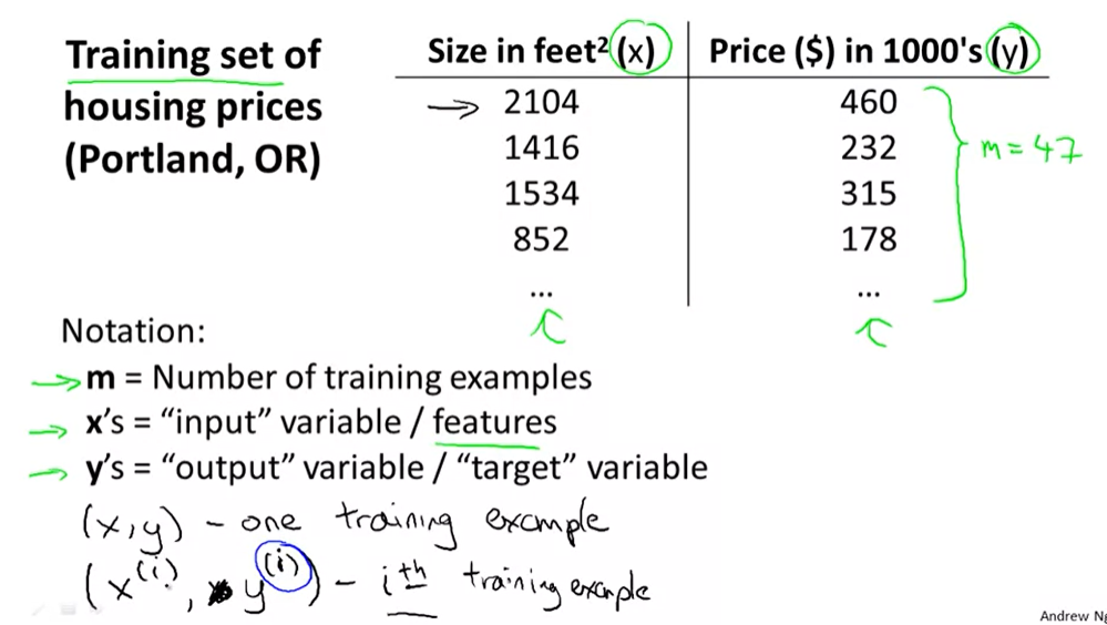 More formally, in supervised learning, we have a data set and this data set is called a training set. So for housing prices example, we have a training set of different housing prices and our job is to learn from this data how to predict prices of the houses. So I'm gonna use lower case m throughout this course to denote the number of training examples. So in this data set, if I have, you know, let's say 47 rows in this table. Then I have 47 training examples and m equals 47. Let me use lowercase x to denote the input variables often also called the features. That would be the x is here, it would the input features. And I'm gonna use y to denote my output variables or the target variable which I'm going to predict and so that's the second column here.