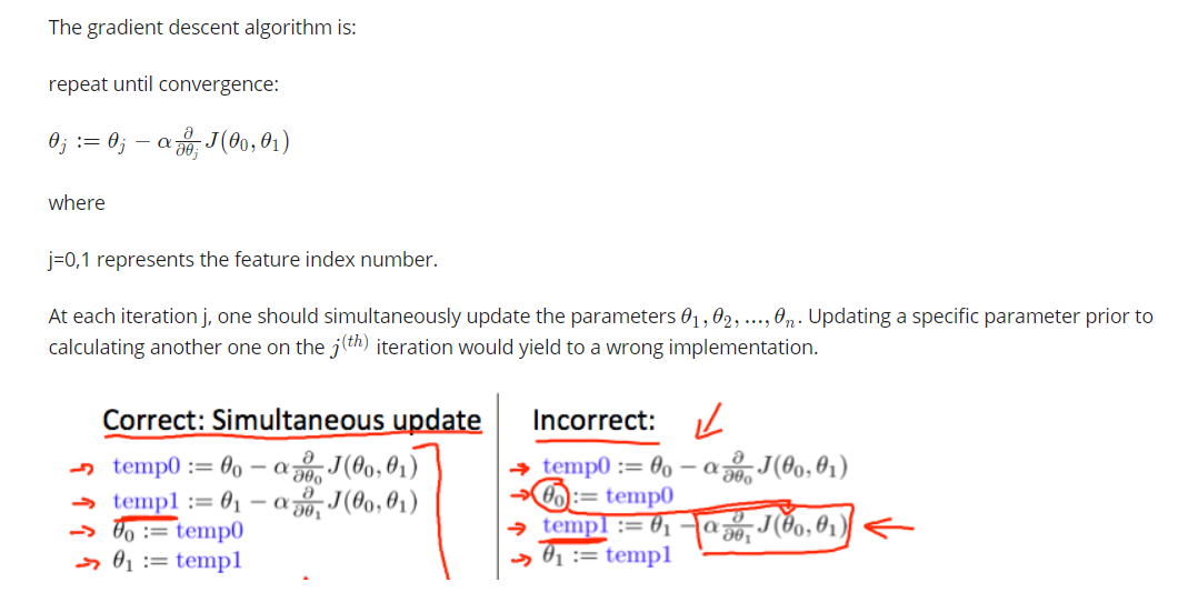 And the difference between the right hand side and the left hand side implementations is that If you look down here, you look at this step, if by this time you've already updated theta 0, then you would be using the new value of theta 0 to compute this derivative term. And so this gives you a different value of temp1, than the left-hand side, right? Because you've now plugged in the new value of theta 0 into this equation. And so, this on the right-hand side is not a correct implementation of gradient descent, okay?