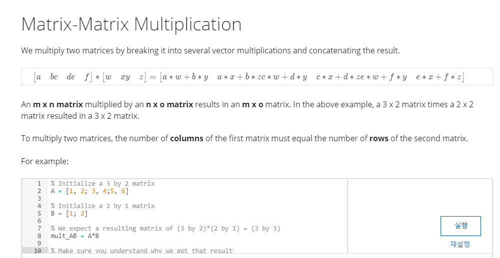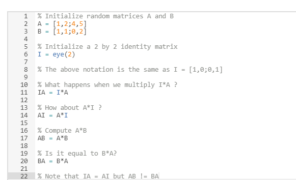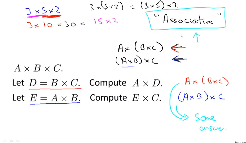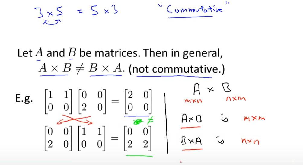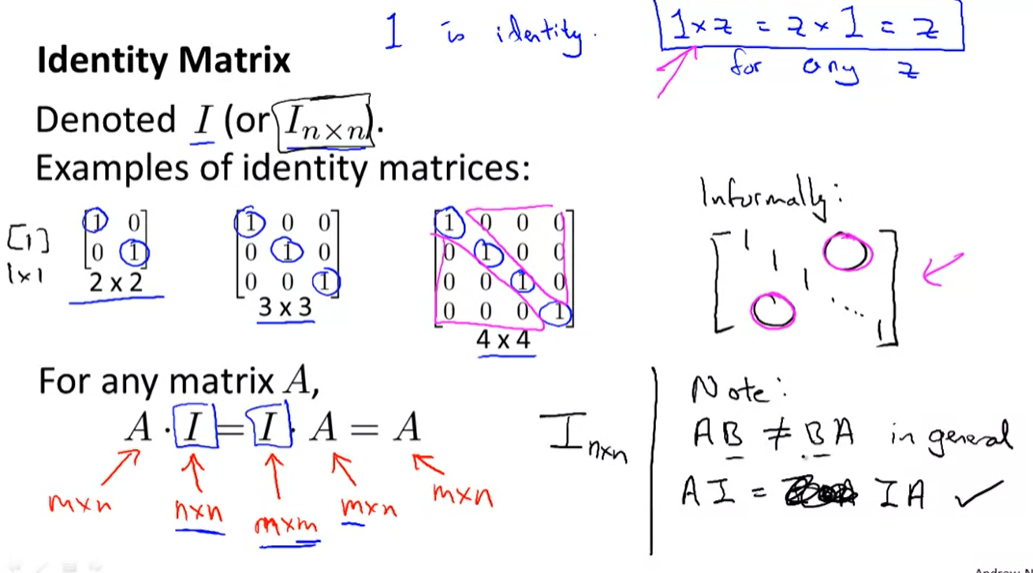 So I'm gonna take this two matrices and just reverse them. It turns out if you multiply these two matrices, you get the second answer on the right. And well clearly, right, these two matrices are not equal to each other.So it doesn't matter whether I multiply 5 x 2 first or whether I multiply 3 x 5 first, because sort of, well, 3 x (5 x 2) = (3 x 5) x 2. And this is called the associative property of real number multiplication. It turns out that matrix multiplication is associative.Finally, I want to tell you about the Identity Matrix, which is a special matrix. So let's again make the analogy to what we know of real numbers. When dealing with real numbers or scalar numbers, the number 1, you can think of it as the identity of multiplication. And what I mean by that is that for any number z, 1 x z = z x 1. And that's just equal to the number z for any real number z. Finally, I just wanna point out that earlier I said that AB is not, in general, equal to BA. Right? For most matrices A and B, this is not true. But when B is the identity matrix, this does hold true, that A times the identity matrix does indeed equal to identity times A is just that you know this is not true for other matrices B in general.