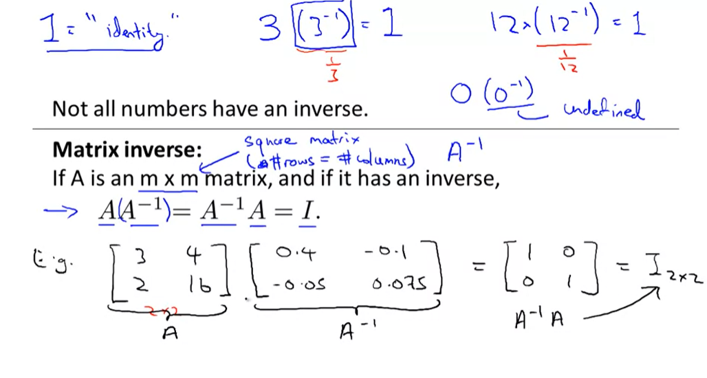 Theinverseof a matrix A is denoted A−1. Multiplying by the inverse results in the identity matrix.