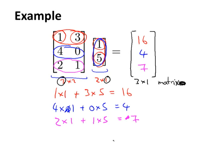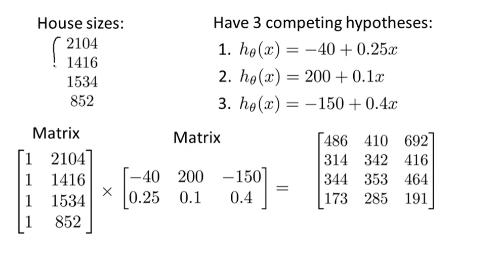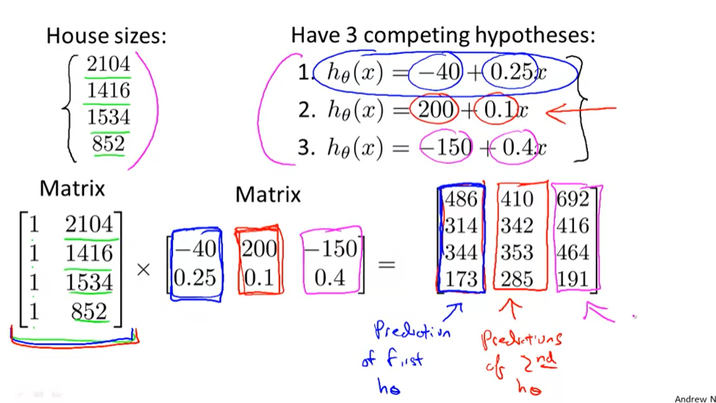 It turns out this "n" here has to match this "n" here. In other words, the number of columns in this matrix, so it's the number of n columns. The number of columns here has to match the number of rows here. It has to match the dimension of this vector. And the result of this product is going to be an n-dimensional vector y. And if you just do this then this variable prediction - sorry for my bad handwriting - then just implement this one line of code assuming you have an appropriate library to do matrix vector multiplication. If you just do this, then prediction becomes this 4 by 1 dimensional vector, on the right, that just gives you all the predicted prices. And your alternative to doing this as a matrix vector multiplication would be to write eomething like , you know, for I equals 1 to 4, right? And you have say a thousand houses it would be for I equals 1 to a thousand or whatever. It turns out, that, by writing code in this style on the left, it allows you to not only simplify the code, because, now, you're just writing one line of code rather than the form of a bunch of things inside. But, for subtle reasons, that we will see later, it turns out to be much more computationally efficient to make predictions on all of the prices of all of your houses doing it the way on the left than the way on the right than if you were to write your own formula.