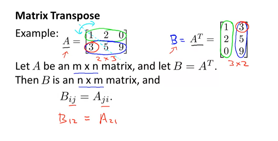 So how did I find this inverse or how did I come up with this inverse over here? It turns out that sometimes you can compute inverses by hand but almost no one does that these days. And it turns out there is very good numerical software for taking a matrix and computing its inverse. So again, this is one of those things where there are lots of open source libraries that you can link to from any of the popular programming languages to compute inverses of matrices. Let me show you a quick example. How I actually computed this inverse, and what I did was I used software called Optive. But the intuition if you want is that you can think of matrices as not have an inverse that is somehow too close to zero in some sense. So, just to wrap up the terminology, matrix that don't have an inverse Sometimes called a singular matrix or degenerate matrix and so this matrix over here is an example zero zero zero matrix. is an example of a matrix that is singular, or a matrix that is degenerate. Finally, the last special matrix operation I want to tell you about is to do matrix transpose. So suppose I have matrix A, if I compute the transpose of A, that's what I get here on the right. This is a transpose which is written and A superscript T, and the way you compute the transpose of a matrix is as follows. To get a transpose I am going to first take the first row of A one to zero. That becomes this first column of this transpose.