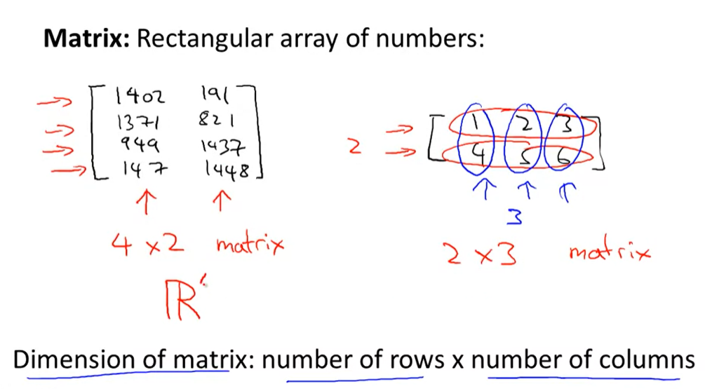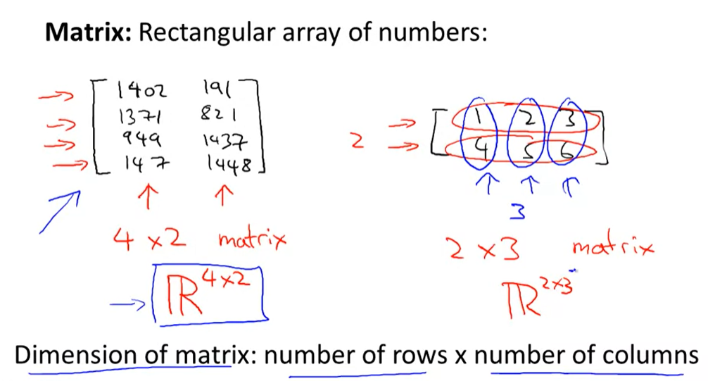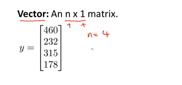 And the other piece of knowledge that we need is that the dimension of the matrix is going to be written as the number of row times the number of columns in the matrix. So, concretely, this example on the left, this has 1, 2, 3, 4 rows and has 2 columns, 1분 14초부터 동영상을 재생하고 스크립트 따르기1:14 and so this example on the left is a 4 by 2 matrix - number of rows by number of columns. So, four rows, two columns. This one on the right, this matrix has two rows. That's the first row, that's the second row, and it has three columns. 1분 35초부터 동영상을 재생하고 스크립트 따르기1:35 That's the first column, that's the second column, that's the third column So, this second matrix we say it is a 2 by 3 matrix.right, because that's 3 2 so that's equal to 1 4 3 7. And finally, 8 4 1 is going to refer to this one right, fourth row, first column is equal to 1 4 7 and if, hopefully you won't, but if you were to write and say well this A 4 3, well, that refers to the fourth row, and the third column that, you know, this matrix has no third column so this is undefined,you know, or you can think of this as an error. There's no such element as 8 4 3, so, you know, you shouldn't be referring to 8 4 3. So, the matrix gets you a way of letting you quickly organize, index and access lots of data. In case I seem to be tossing up a lot of concepts, a lot of new notations very rapidly, you don't need to memorize all of this, but on the course website where we have posted the lecture notes, we also have all of these definitions written down. A vector is a matrix that has only 1 column so you have an N x 1 matrix, then that's a remember, right? N is the number of rows, and 1 here is the number of columns, so, so matrix with just one column is what we call a vector. So here's an example of a vector, with I guess I have N equals four elements here.you should assume we are using one index vectors. In fact, throughout the rest of these videos on linear algebra review, I will be using one index vectors. vectors as well. Finally, by convention, usually when writing matrices and vectors, most people will use upper case to refer to matrices. So we're going to use capital letters like A, B, C, you know, X, to refer to matrices, 8분 16초부터 동영상을 재생하고 스크립트 따르기8:16and usually we'll use lowercase, like a, b, x, y, 8분 21초부터 동영상을 재생하고 스크립트 따르기8:21to refer to either numbers, or just raw numbers or scalars or to vectors. This isn't always true but this is the more common notation where we use lower case "Y" for referring to vector and we usually use upper case to refer to a matrix.