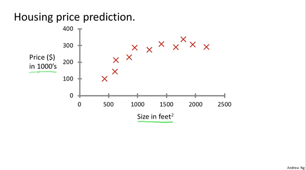Given data about the size of houses on the real estate market, try to predict their price. Price as a function of size is a continuous output, so this is a regression problem.