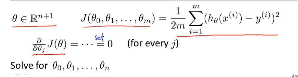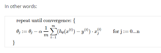 }repeat until convergence:{θj:=θj−α1m∑i=1m(hθ(x(i))−y(i))⋅x(i)jfor j := 0...n