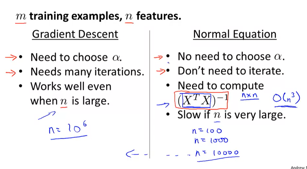 With the normal equation, computing the inversion has complexity\mathcal{O}(n^3)O(n3). So if we have a very large number of features, the normal equation will be slow. In practice, when n exceeds 10,000 it might be a good time to go from a normal solution to an iterative process.
