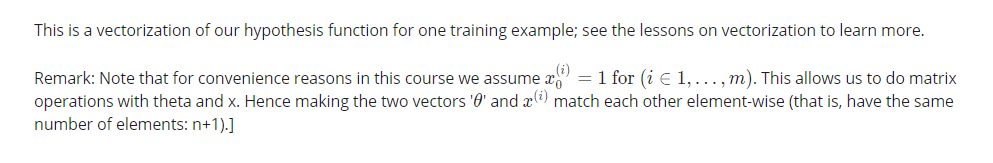 This allows us to do matrix operations with theta and x. Hence making the two vectors '\thetaθ' andx^{(i)}x(i)match each other element-wise (that is, have the same number of elements: n+1).]This is a vectorization of our hypothesis function for one training example; see the lessons on vectorization to learn more.