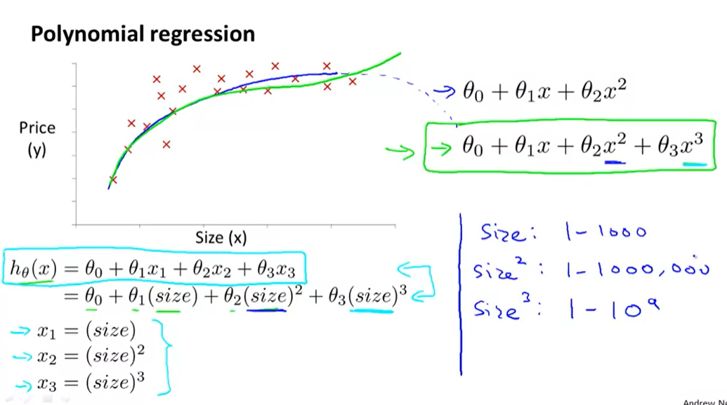 sometimes by defining new features you might actually get a better model. One thing you could do is fit a quadratic model like this. It doesn't look like a straight line fits this data very well. So maybe you want to fit a quadratic model like this where you think the size, where you think the price is a quadratic function and maybe that'll give you, you know, a fit to the data that looks like that. But then you may decide that your quadratic model doesn't make sense because of a quadratic function, eventually this function comes back down and well, we don't think housing prices should go down when the size goes up too high. So then maybe we might choose a different polynomial model and choose to use instead a cubic function, and where we have now a third-order term and we fit that, maybe we get this sort of model, and maybe the green line is a somewhat better fit to the data cause it doesn't eventually come back down. which is that if you choose your features like this, then feature scaling becomes increasingly important. So if the size of the house ranges from one to a thousand, so, you know, from one to a thousand square feet, say, then the size squared of the house will range from one to one million, the square of a thousand, and your third feature x cubed, excuse me you, your third feature x three, which is the size cubed of the house, will range from one two ten to the nine, and so these three features take on very different ranges of values, and it's important to apply feature scaling if you're using gradient descent to get them into comparable ranges of values.