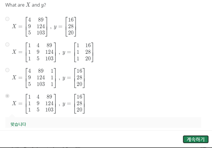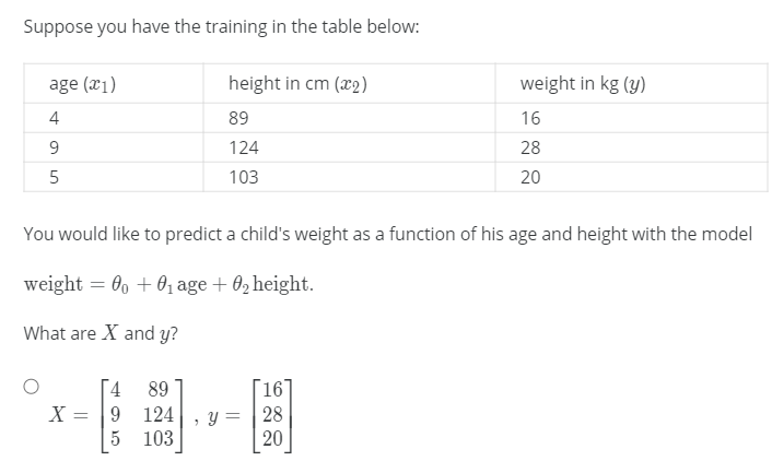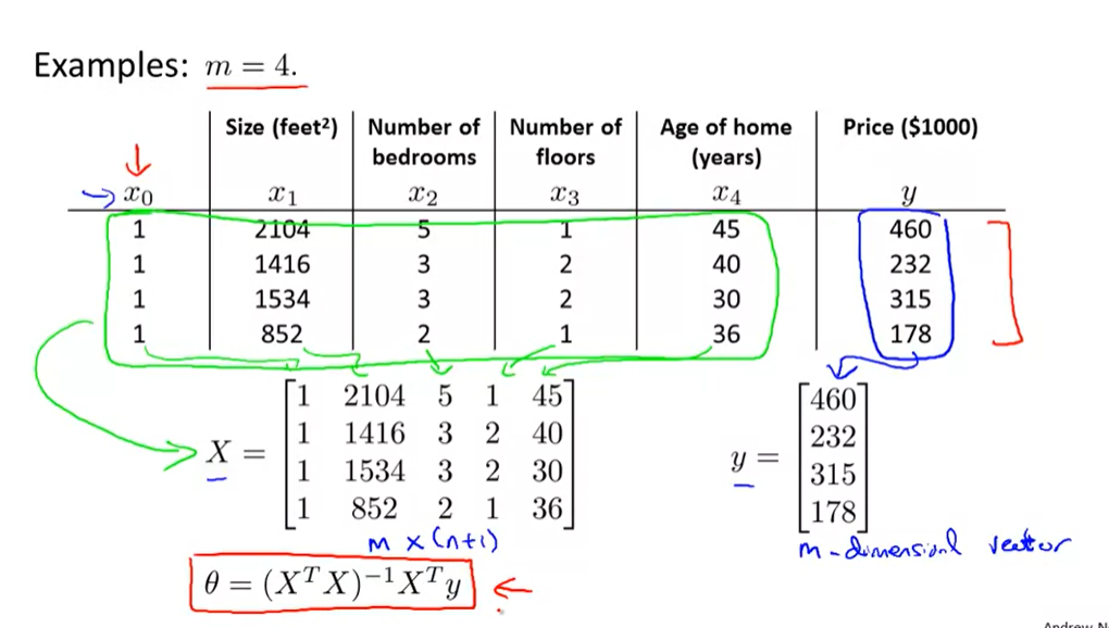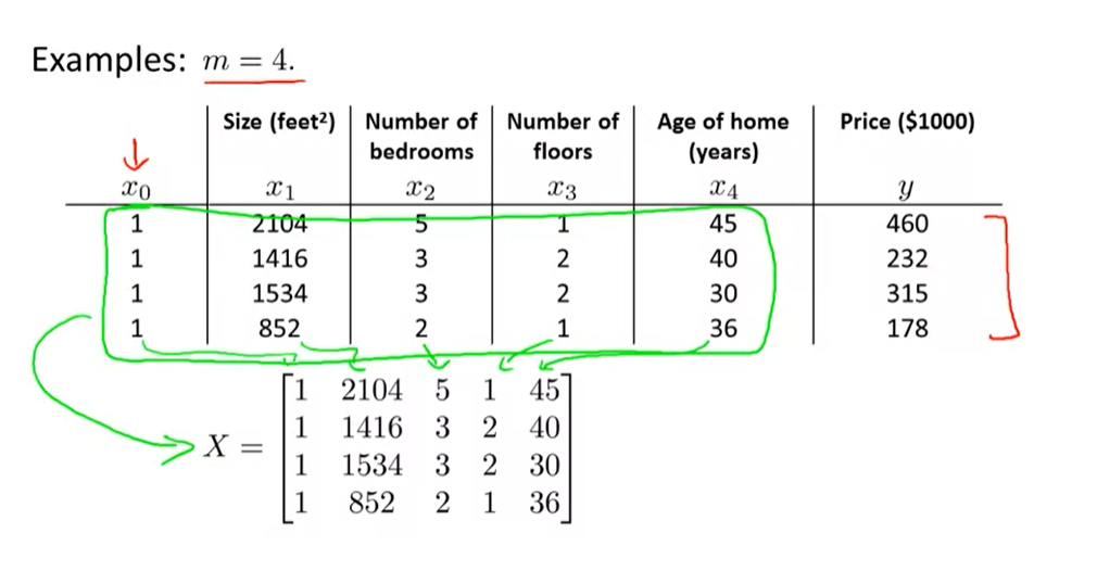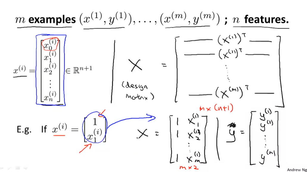 Note:[8:00 to 8:44 - The design matrix X (in the bottom right side of the slide) given in the example should have elements x with subscript 1 and superscripts varying from 1 to m because for all m training sets there are only 2 featuresx_0x0andx_1x1. 12:56 - The X matrix is m by (n+1) and NOT n by n. ]