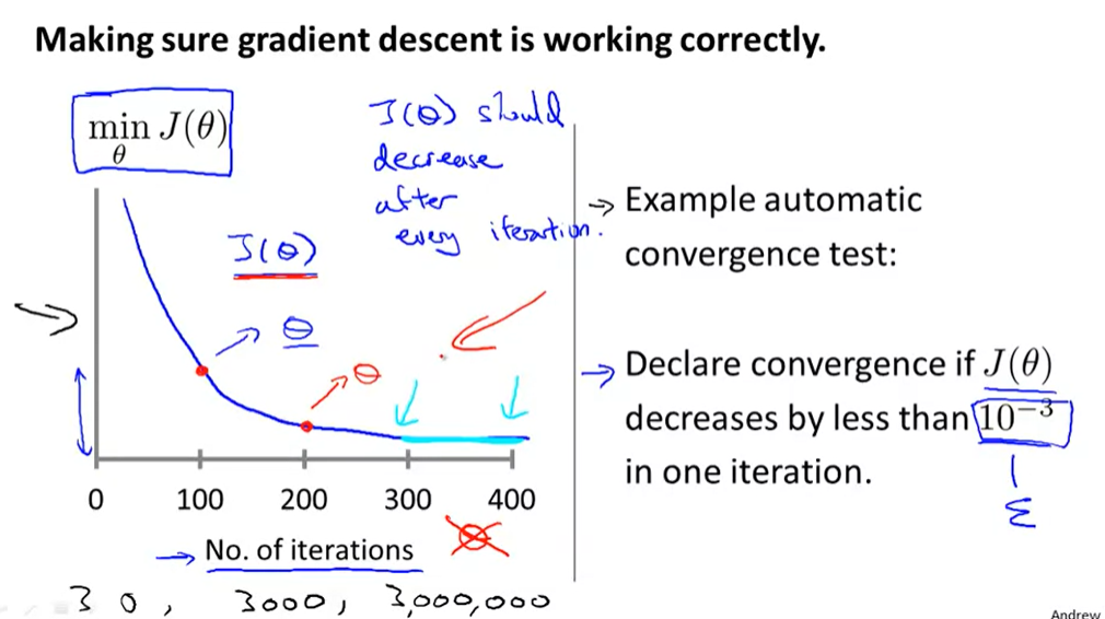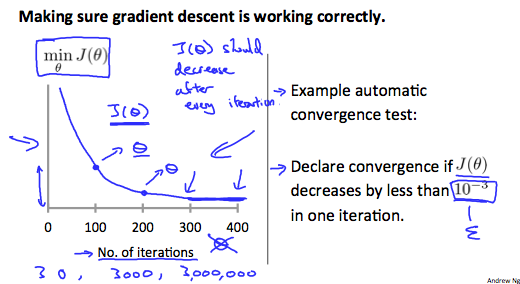 Automatic convergence test.Declare convergence if J(θ) decreases by less than E in one iteration, where E is some small value such as10^{−3}10−3. However in practice it's difficult to choose this threshold value.