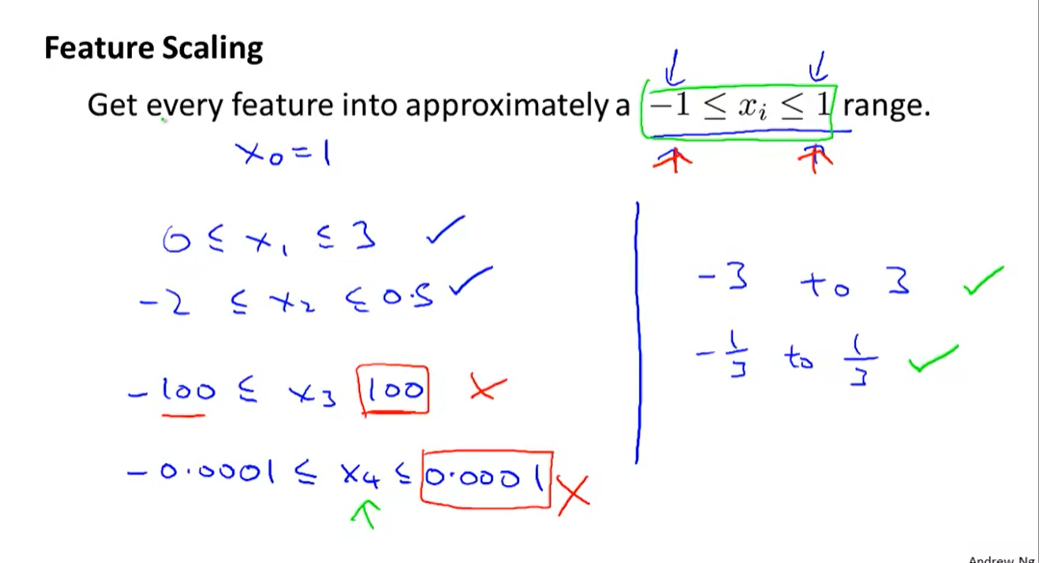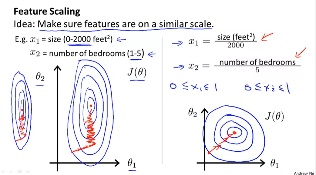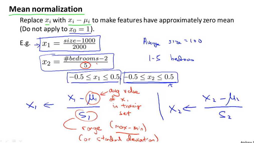 Two techniques to help with this arefeature scalingandmean normalization. Feature scaling involves dividing the input values by the range (i.e. the maximum value minus the minimum value) of the input variable, resulting in a new range of just 1. Mean normalization involves subtracting the average value for an input variable from the values for that input variable resulting in a new average value for the input variable of just zero. To implement both of these techniques, adjust your input values as shown in this formula: