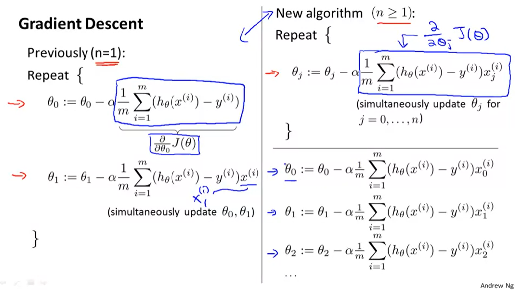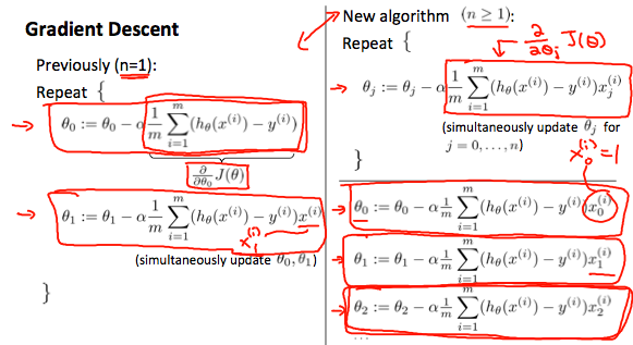 }repeat until convergence:{θ0:=θ0−α1m∑i=1m(hθ(x(i))−y(i))⋅x(i)0θ1:=θ1−α1m∑i=1m(hθ(x(i))−y(i))⋅x(i)1θ2:=θ2−α1m∑i=1m(hθ(x(i))−y(i))⋅x(i)2⋯