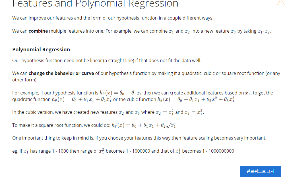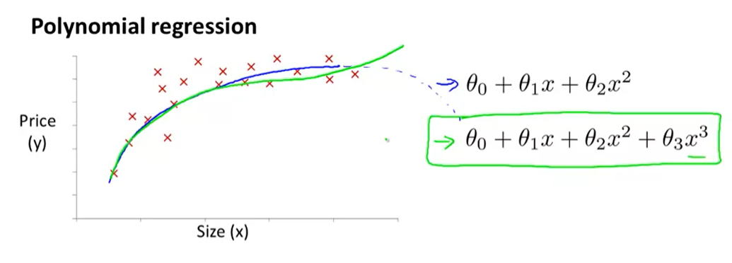 For example, if our hypothesis function ish_\theta(x) = \theta_0 + \theta_1 x_1hθ(x)=θ0+θ1x1then we can create additional features based onx_1x1, to get the quadratic functionh_\theta(x) = \theta_0 + \theta_1 x_1 + \theta_2 x_1^2hθ(x)=θ0+θ1x1+θ2x12or the cubic functionh_\theta(x) = \theta_0 + \theta_1 x_1 + \theta_2 x_1^2 + \theta_3 x_1^3hθ(x)=θ0+θ1x1+θ2x12+θ3x13