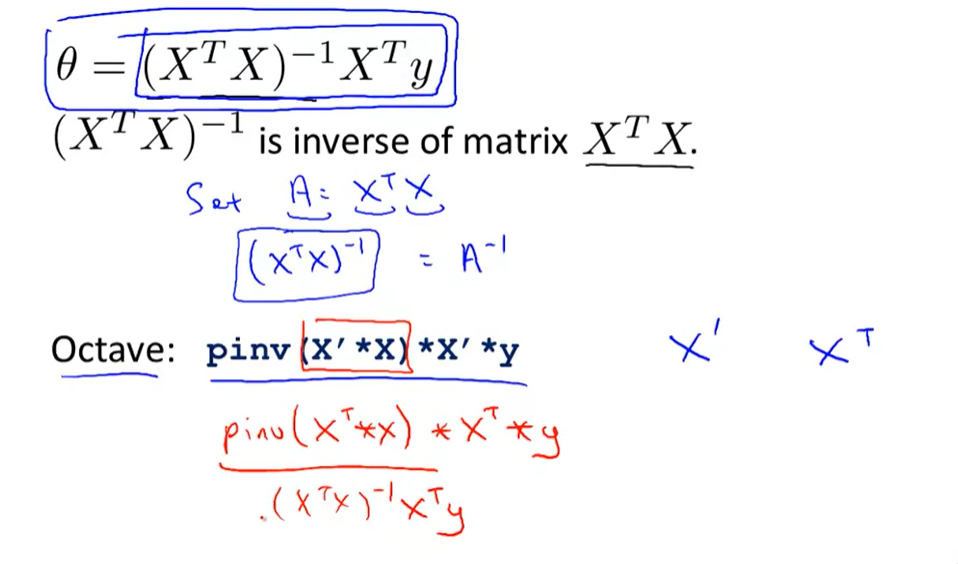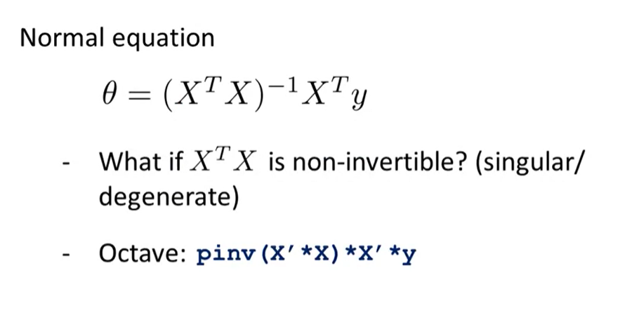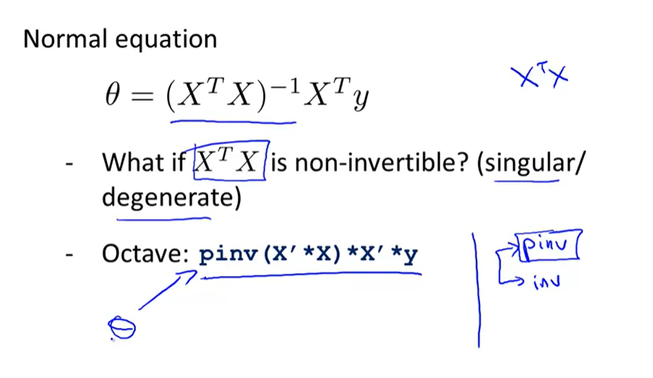 When implementing the normal equation in octave we want to use the 'pinv' function rather than 'inv.' The 'pinv' function will give you a value of\thetaθeven ifX^TXXTXis not invertible.