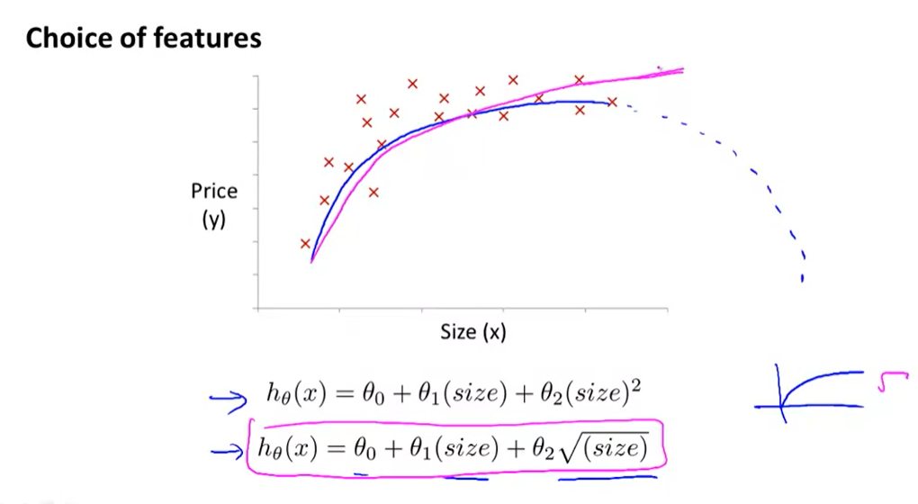 To make it a square root function, we could do:h_\theta(x) = \theta_0 + \theta_1 x_1 + \theta_2 \sqrt{x_1}hθ(x)=θ0+θ1x1+θ2x1