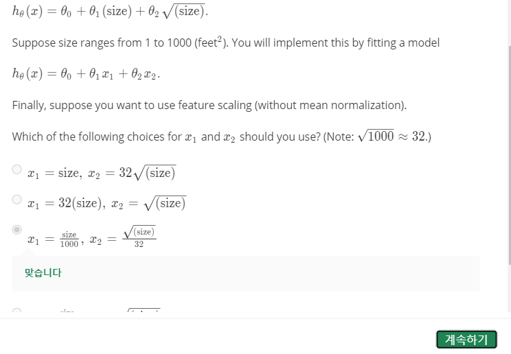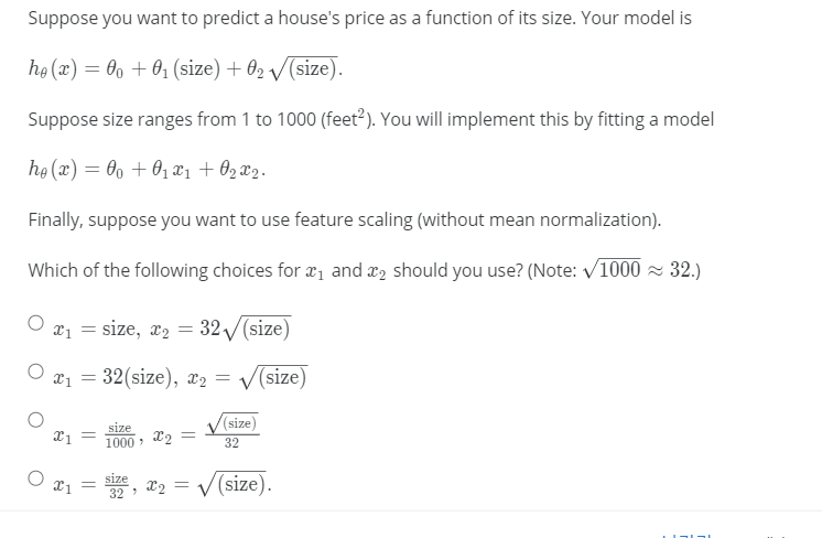 you can show mathematically, you can find a much more direct path to the global minimum rather than taking a much more convoluted path where you're sort of trying to follow a much more complicated trajectory to get to the global minimum. 2분 57초부터 동영상을 재생하고 스크립트 따르기2:57So, by scaling the features so that there are, the consumer ranges of values. In this example, we end up with both features, X one and X two, between zero and one.