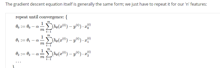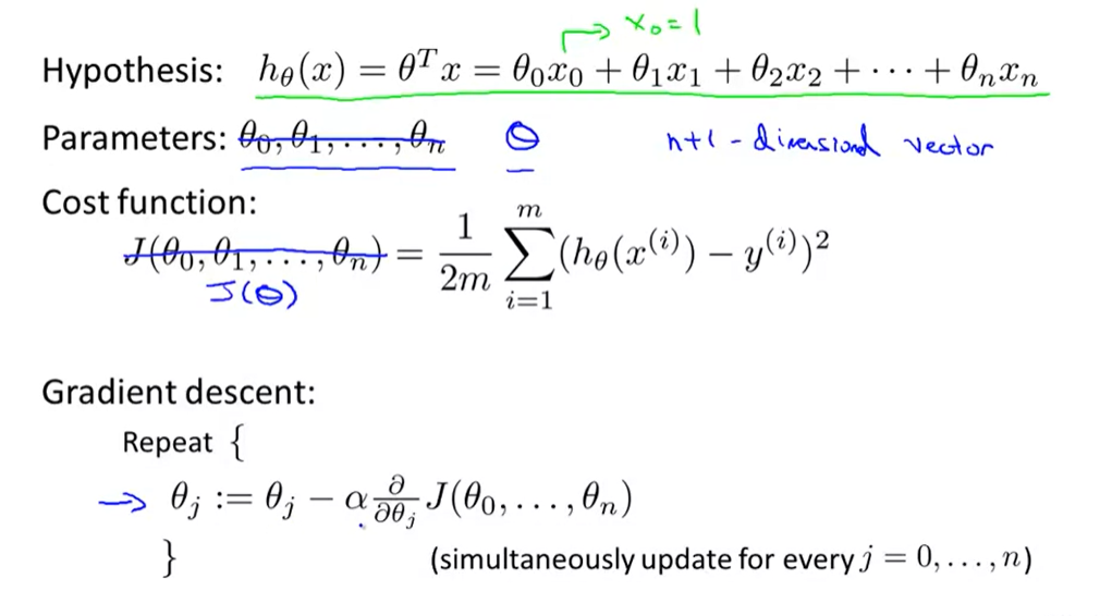 The gradient descent equation itself is generally the same form; we just have to repeat it for our 'n' features: