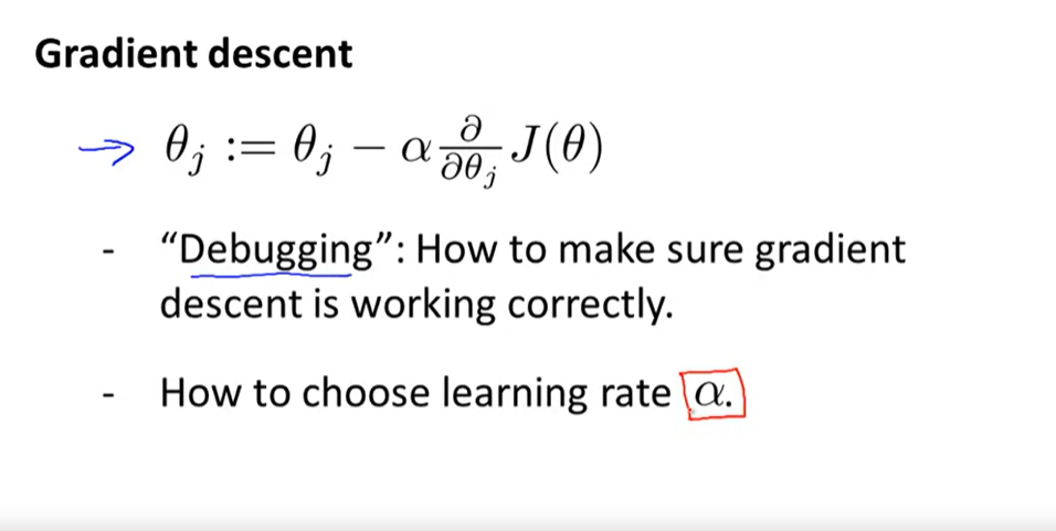Concretely, here's the gradient descent update rule. And what I want to do in this video is tell you about what I think of as debugging, and some tips for making sure that gradient descent is working correctly. And second, I wanna tell you how to choose the learning rate alpha or at least how I go about choosing it.