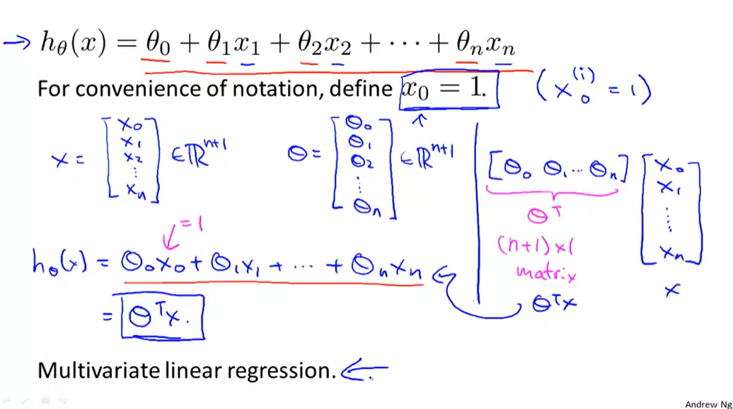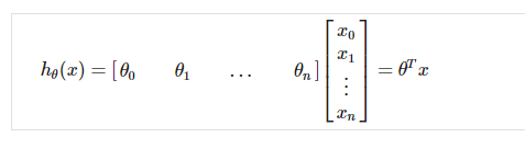 hθ(x)=[θ0θ1...θn]⎡⎣⎢⎢⎢x0x1⋮xn⎤⎦⎥⎥⎥=θTx