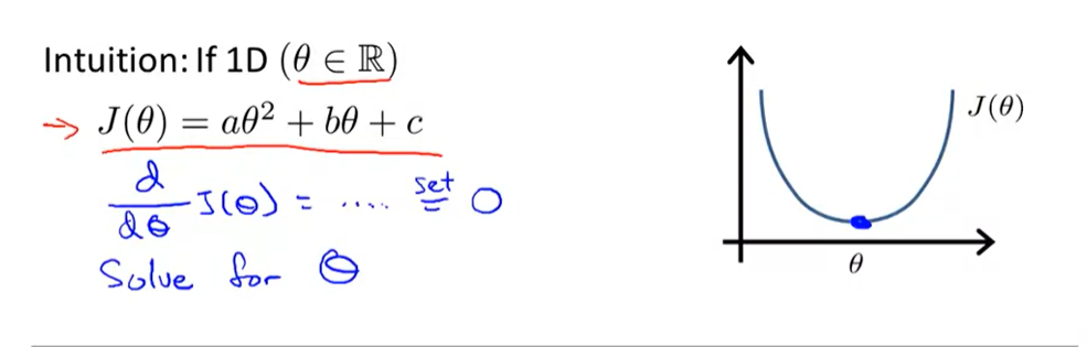 let's take a very simplified cost function J of Theta, that's just the function of a real number Theta. So, for now, imagine that Theta is just a scalar value or that Theta is just a row value. It's just a number, rather than a vector. you may know that the way to minimize a function is to take derivatives and to set derivatives equal to zero. So, you take the derivative of J with respect to the parameter of Theta. You get some formula which I am not going to derive, you set that derivative equal to zero, and this allows you to solve for the value of Theda that minimizes J of Theta.