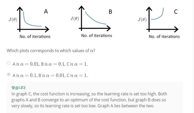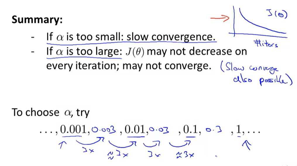 What I actually do is try this range of values. 8분 6초부터 동영상을 재생하고 스크립트 따르기8:06And so on, where this is 0.001. I'll then increase the learning rate threefold to get 0.003. And then this step up, this is another roughly threefold increase from 0.003 to 0.01. And so these are, roughly, trying out gradient descents with each value I try being about 3x bigger than the previous value. So what I'll do is try a range of values until I've found one value that's too small and made sure that I've found one value that's too large. And then I'll sort of try to pick the largest possible value, or just something slightly smaller than the largest reasonable value that I found. And when I do that usually it just gives me a good learning rate for my problem. And if you do this too, maybe you'll be able to choose a good learning rate for your implementation of gradient descent.