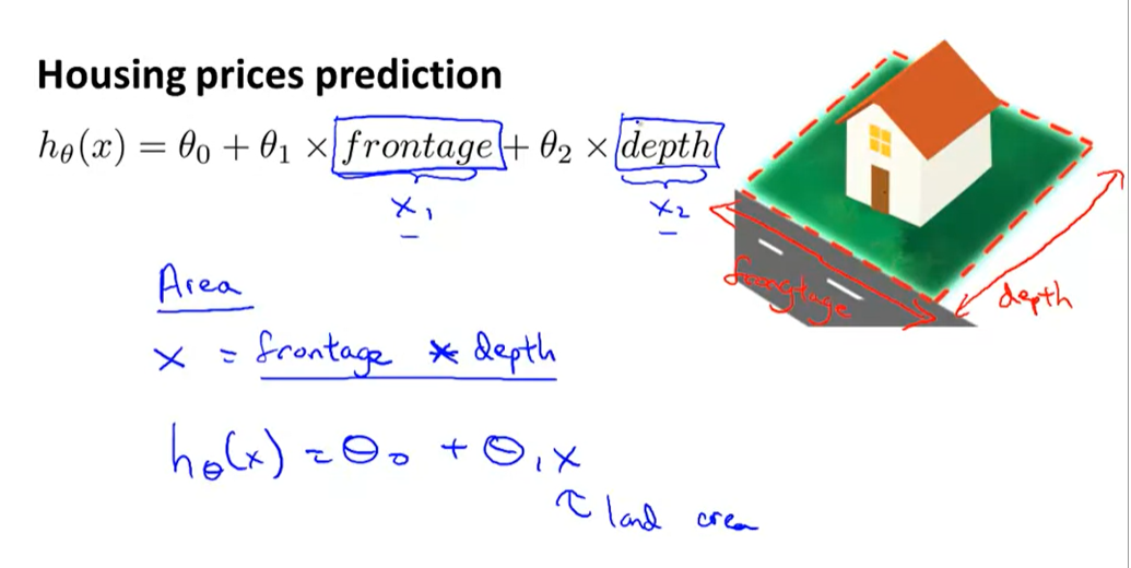 In order to develop intuition about this function, we can think about\theta_0θ0as the basic price of a house,\theta_1θ1as the price per square meter,\theta_2θ2as the price per floor, etc.x_1x1will be the number of square meters in the house,x_2x2the number of floors, etc.