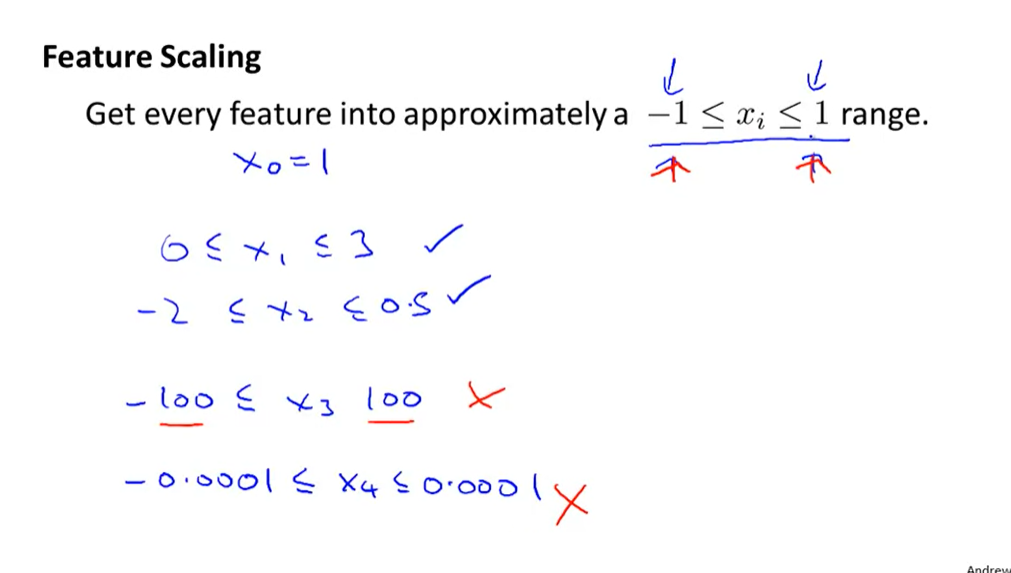 So you want the range of values, you know, can be bigger than plus or smaller than plus one, but just not much bigger, like plus 100 here, or too much smaller like 0.00 one over there. Different people have different rules of thumb. But the one that I use is that if a feature takes on the range of values from say minus three the plus 3 how you should think that should be just fine, but maybe it takes on much larger values than plus 3 or minus 3 unless not to worry and if it takes on values from say minus one-third to one-third.subtract the mean of the feature and divide it by the range of values meaning the max minus min. And this sort of formula will get your features, you know, maybe not exactly, but maybe roughly into these sorts of ranges, and by the way, for those of you that are being super careful technically if we're taking the range as max minus min this five here will actually become a four. So if max is 5 minus 1 then the range of their own values is actually equal to 4, but all of these are approximate and any value that gets the features into anything close to these sorts of ranges will do fine. And the feature scaling doesn't have to be too exact, in order to get gradient descent to run quite a lot faster.