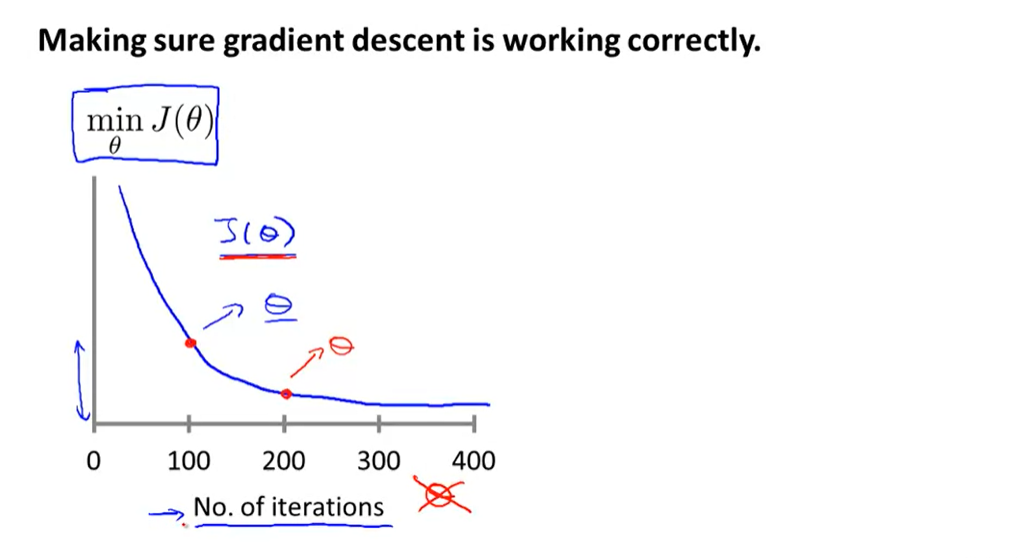 Notice that the x axis is number of iterations. Previously we where looking at plots of J(theta) where the x axis, where the horizontal axis, was the parameter vector theta but this is not what this is. Concretely, what this point is, is I'm going to run gradient descent for 100 iterations. And whatever value I get for theta after 100 iterations, I'm going to get some value of theta after 100 iterations. And I'm going to evaluate the cost function J(theta). For the value of theta I get after 100 iterations, and this vertical height is the value of J(theta). For the value of theta I got after 100 iterations of gradient descent. And this point here that corresponds to the value of J(theta) for the theta that I get after I've run gradient descent for 200 iterations.