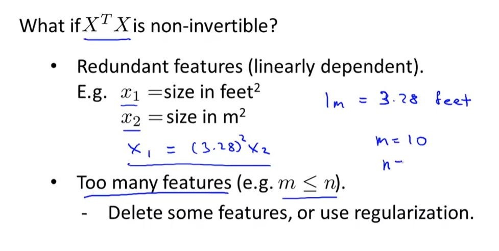 In this video I want to talk about the Normal equation and non-invertibility. This is a somewhat more advanced concept, but it's something that I've often been asked about. And so I want to talk it here and address it here. But this is a somewhat more advanced concept, so feel free to consider this optional material. So for those of you that know a bit more linear algebra you may know that only some matrices are invertible and some matrices do not have an inverse we call those non-invertible matrices. Singular or degenerate matrices.but Octave hast two functions for inverting matrices. One is called pinv, and the other is called inv. And the differences between these two are somewhat technical. One's called the pseudo-inverse, one's called the inverse. But you can show mathematically that so long as you use the pinv function then this will actually compute the value of data that you want even if X transpose X is non-invertible. The first cause is if somehow in your learning problem you have redundant features. Concretely, if you're trying to predict housing prices and if x1 is the size of the house in feet, in square feet and x2 is the size of the house in square meters, then you know 1 meter is equal to 3.28 feet Rounded to two decimals. And so your two features will always satisfy the constraint x1 equals 3.28 squared times x2. And you can show for those of you that are somewhat advanced in linear Algebra, but if you're explaining the algebra you can actually show that if your two features are related, are a linear equation like this. Then matrix X transpose X would be non-invertable. The second thing that can cause X transpose X to be non-invertable is if you are training, if you are trying to run the learning algorithm with a lot of features. Concretely, if m is less than or equal to n. For example, if you imagine that you have m = 10 training examples that you have n equals 100 features then you're trying to fit a parameter back to theta which is, you know, n plus one dimensional. So this is 101 dimensional, you're trying to fit 101 parameters from just 10 training examples. But commonly what we do then if m is less than n, is to see if we can either delete some features or to use a technique called regularization which is something that we'll talk about later in this class as well, that will kind of let you fit a lot of parameters, use a lot features, even if you have a relatively small training set. But this regularization will be a later topic in this course.