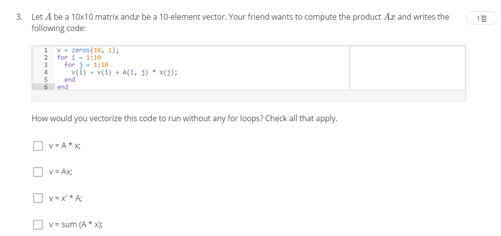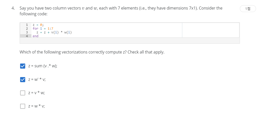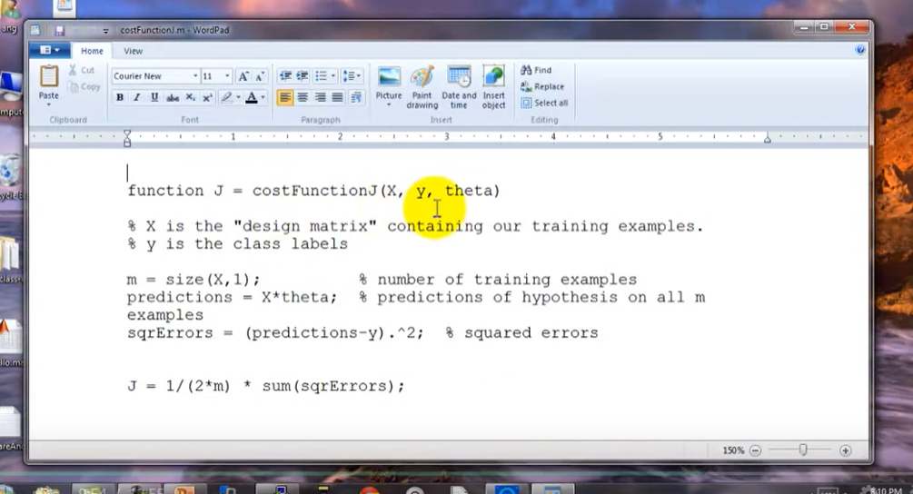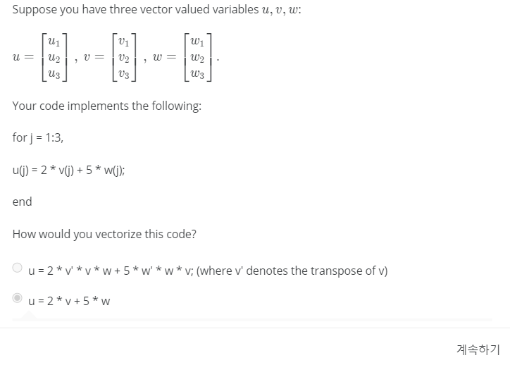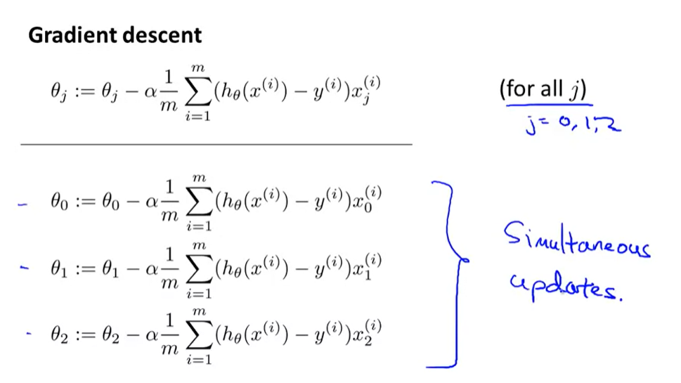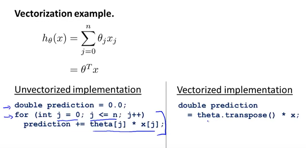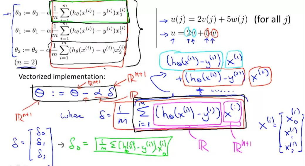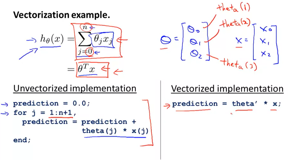 , here's how you would write a vectorized implementation, which is that you would think of a x and theta as vectors. You just said prediction = theta' * x. You're just computing like so. So instead of writing all these lines of code with a for loop, you instead just have one line of code. And what this line of code on the right will do is, it will use Octaves highly optimized numerical linear algebra routines to compute this inner product between the two vectors, theta and X, and not only is the vectorized implementation simpler, it will also run much more efficiently.And concretely, the three elements of delta correspond if n = 2, the three elements of delta correspond exactly to this thing, to the second thing, and this third thing. Which is why when you update theta according to theta- alpha delta, we end up carrying exactly the same simultaneous updates as the update rules that we have up top.We said that in order to vectorize this code we will instead said u = 2v + 5w. So we're saying that the vector u is equal to two times the vector v plus five times the vector w. So this is an example of how to add different vectors and this summation's the same thing. This is saying that the summation over here is just some real number, right? That's kinda like the number two or some other number times the vector, x1. So it's kinda like 2v or say some other number times x1, and then plus instead of 5w we instead have some other real number, plus some other vector, and then you add on other vectors, plus dot, dot, dot, plus the other vectors, which is why, over all, this thing over here, that whole quantity, that delta is just some vector.