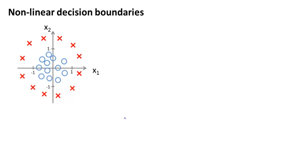 Earlier when we were talking about polynomial regression or when we're talking about linear regression, we talked about how we could add extra higher order polynomial terms to the features. And we can do the same for logistic regression. Concretely, let's say my hypothesis looks like this where I've added two extra features, x1 squared and x2 squared, to my features. So that I now have five parameters, theta zero through theta four. What this means is that with this particular choose of parameters, my parameter effect theta theta looks like minus one, zero, zero, one, one.