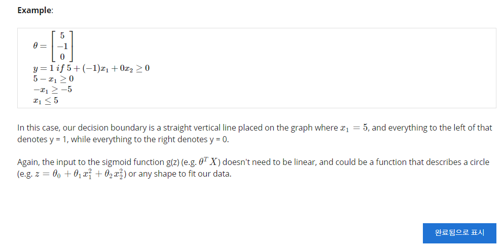 In this case, our decision boundary is a straight vertical line placed on the graph wherex_1 = 5x1=5, and everything to the left of that denotes y = 1, while everything to the right denotes y = 0.