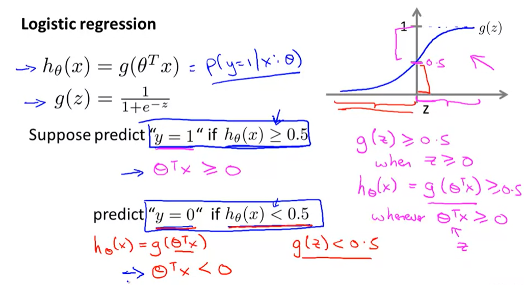 hθ(x)=g(θTx)≥0.5whenθTx≥0