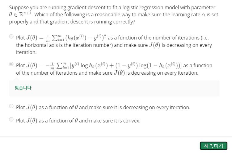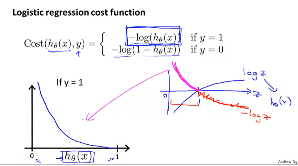 Similarly, when y = 0, we get the following plot forJ(\theta)J(θ)vsh_\theta (x)hθ(x):