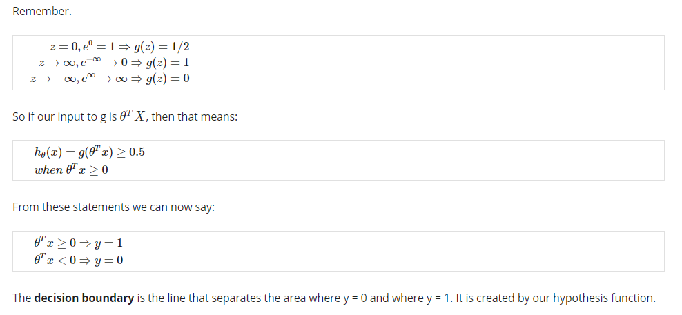 Thedecision boundaryis the line that separates the area where y = 0 and where y = 1. It is created by our hypothesis function.