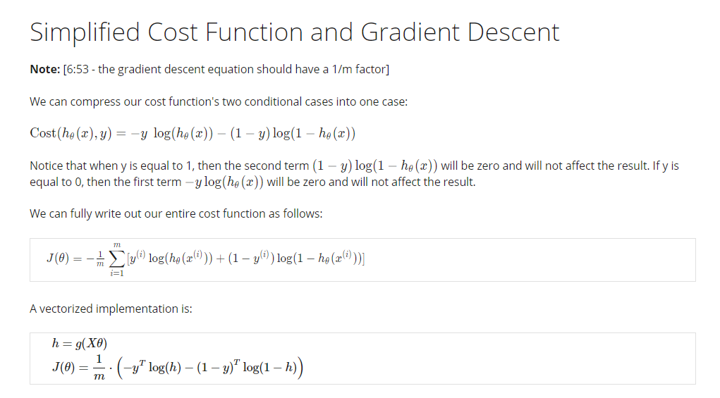 J(θ)=1m∑i=1mCost(hθ(x(i)),y(i))Cost(hθ(x),y)=−log(hθ(x))Cost(hθ(x),y)=−log(1−hθ(x))if y = 1if y = 0