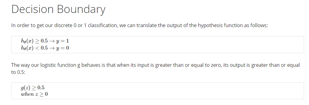 In order to get our discrete 0 or 1 classification, we can translate the output of the hypothesis function as follows: