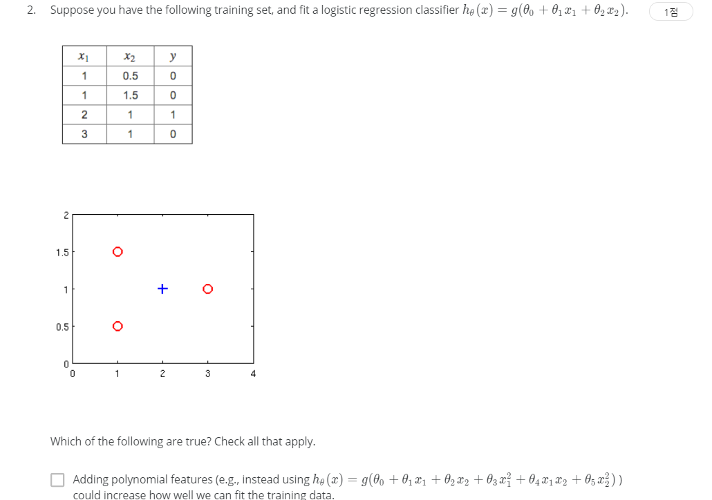 만약 classifcation문제에서 앞의 regression 문제처럼 linear regression을 사용하게 되면 0,1 만 나뉘어지는 자료에서 0,1외의 수가 나오는 것은 물론이고 위의 예처럼 완전 동떨어진 예가 있다면 그 중간 (평균)이 지나치게 치우쳐지는 문제가 일어난다. 따라서 classifcation 문제에서는 sigmoid function 즉 지수함수를 이용해서 h(x)를 표현하게 되고 그 결과 logistic regression 함수가 나오게 된다. classifcation 문제이지만 logistic 'regression'이름인것은 가볍게 인정하도록 하자.