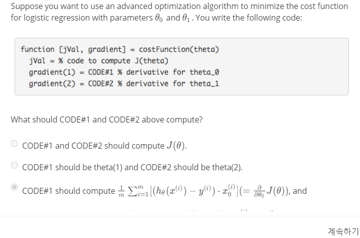 Given code that can do these two things, what gradient descent does is it repeatedly performs the following update. Right? So given the code that we wrote to compute these partial derivatives, gradient descent plugs in here and uses that to update our parameters theta.But let me just tell you about some of their properties. 2분 40초부터 동영상을 재생하고 스크립트 따르기2:40These three algorithms have a number of advantages. One is that, with any of this algorithms you usually do not need to manually pick the learning rate alpha. 2분 50초부터 동영상을 재생하고 스크립트 따르기2:50So one way to think of these algorithms is that given is the way to compute the derivative and a cost function. You can think of these algorithms as having a clever inter-loop. And, in fact, they have a clever 3분 1초부터 동영상을 재생하고 스크립트 따르기3:01inter-loop called a line search algorithm that automatically tries out different values for the learning rate alpha and automatically picks a good learning rate alpha so that it can even pick a different learning rate for every iteration. And so then you don't need to choose it yourself.The value that minimizes it is going to be theta 1 equals 5, theta 2 equals equals five. 6분 15초부터 동영상을 재생하고 스크립트 따르기6:15Now, again, I know some of you know more calculus than others, but the derivatives of the cost function J turn out to be these two expressions. I've done the calculus. 6분 26초부터 동영상을 재생하고 스크립트 따르기6:26So if you want to apply one of the advanced optimization algorithms to minimize cost function J. So, you know, if we didn't know the minimum was at 5, 5, but if you want to have a cost function 5 the minimum numerically using something like gradient descent but preferably more advanced than gradient descent, what you would do is implement an octave function like this, so we implement a cost function, the first J-val, is how 6분 58초부터 동영상을 재생하고 스크립트 따르기6:58we would compute the cost function J. And so this says J-val equals, you know, theta one minus five squared plus theta two minus five squared. So it's just computing this cost function over here. 7분 10초부터 동영상을 재생하고 스크립트 따르기7:10And the second argument that this function returns is gradient. So gradient is going to be a two by one vector, 7분 18초부터 동영상을 재생하고 스크립트 따르기7:18and the two elements of the gradient vector correspond to the two partial derivative terms over here. 7분 27초부터 동영상을 재생하고 스크립트 따르기7:27Having implemented this cost function, 7분 29초부터 동영상을 재생하고 스크립트 따르기7:29you would, you can then 7분 31초부터 동영상을 재생하고 스크립트 따르기7:31call the advanced optimization 7분 34초부터 동영상을 재생하고 스크립트 따르기7:34function called the fminunc - it stands for function minimization unconstrained in Octave -and the way you call this is as follows. function called the fminunc - it stands for function minimization unconstrained in Octave -and the way you call this is as follows. You set a few options. This is a options as a data structure that stores the options you want. So grant up on, this sets the gradient objective parameter to on. It just means you are indeed going to provide a gradient to this algorithm. I'm going to set the maximum number of iterations to, let's say, one hundred. We're going give it an initial guess for theta. There's a 2 by 1 vector. And then this command calls fminunc. This at symbol presents a pointer to the cost function The function value at the optimum is essentially 10 to the minus 30. So that's essentially zero, which is also what we're hoping for. And the exit flag is 1, and this shows what the convergence status of this. And if you want you can do help fminunc to read the documentation for how to interpret the exit flag. But the exit flag let's you verify whether or not this algorithm thing has converged.