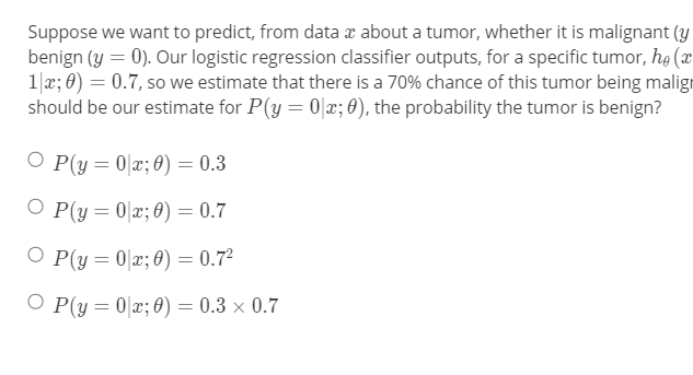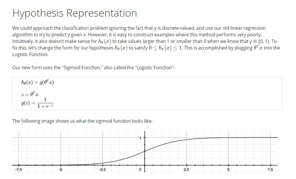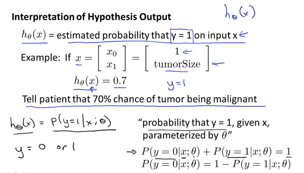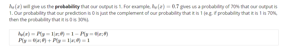h_\thetahθwill give us theprobabilitythat our output is 1. For example,h_\theta(x)=0.7hθ(x)=0.7gives us the probability of 70% that our output is 1.
