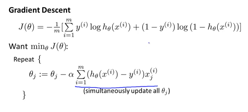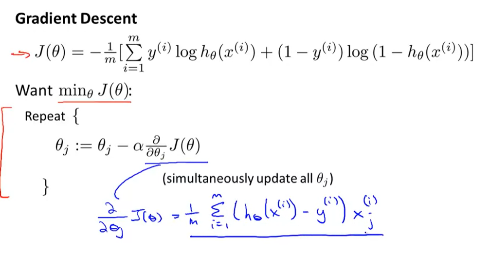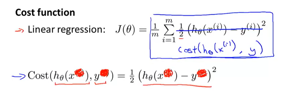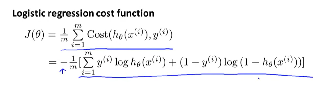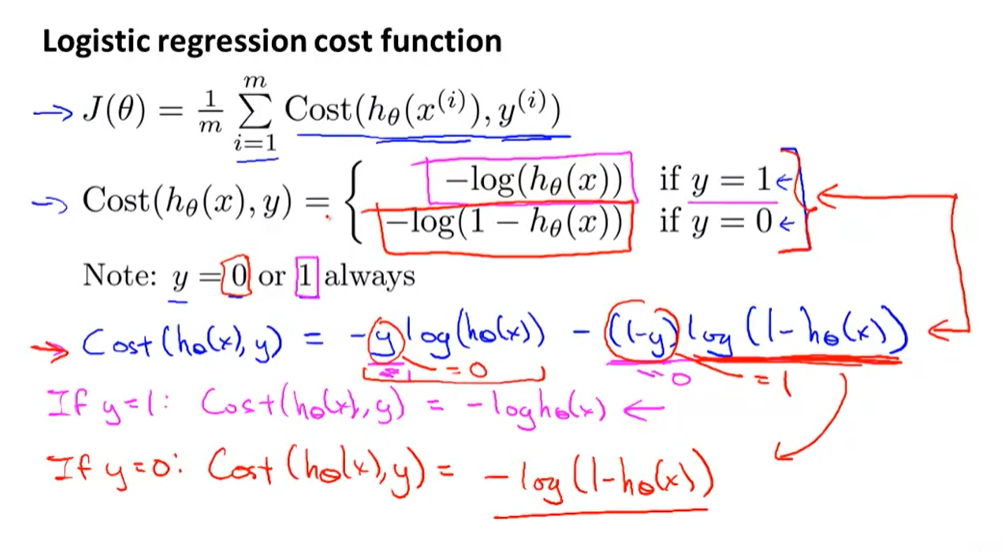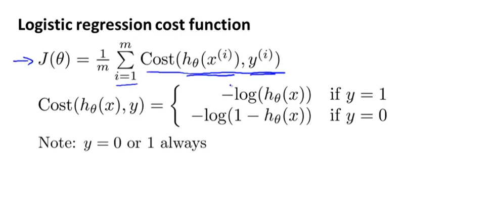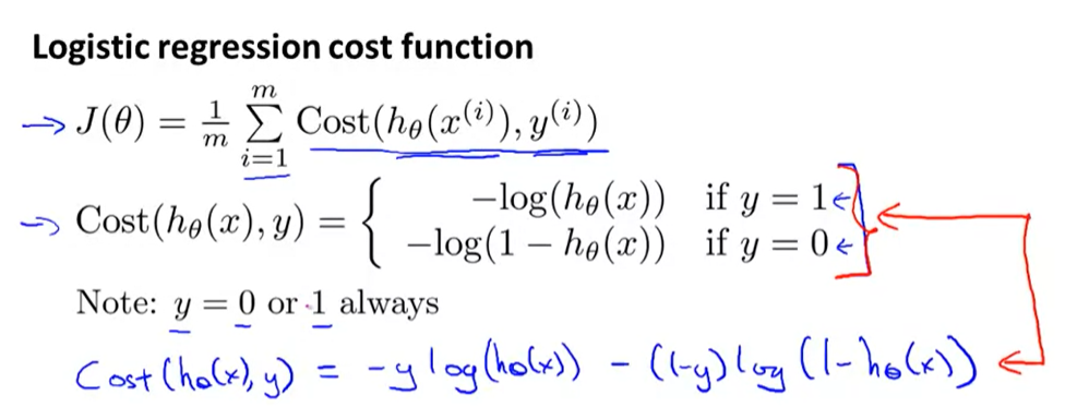 J(θ)=1m∑i=1mCost(hθ(x(i)),y(i))Cost(hθ(x),y)=−log(hθ(x))Cost(hθ(x),y)=−log(1−hθ(x))if y = 1if y = 0