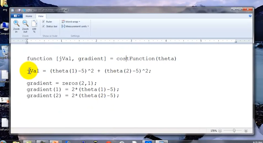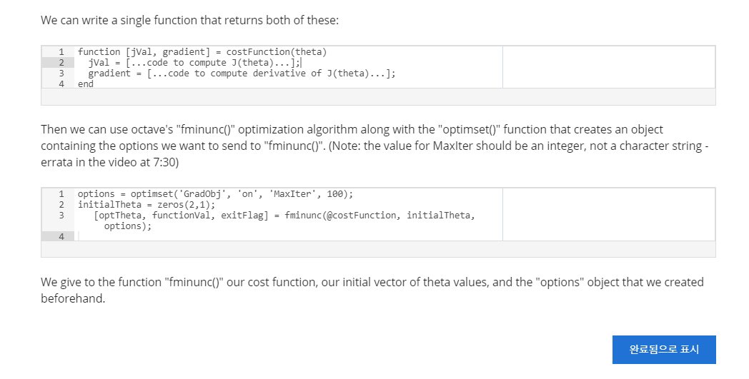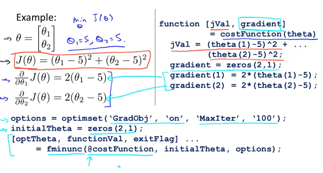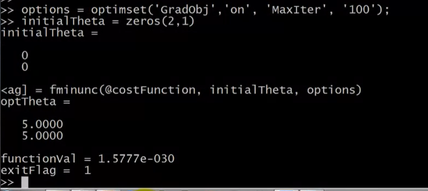 Then we can use octave's "fminunc()" optimization algorithm along with the "optimset()" function that creates an object containing the options we want to send to "fminunc()". (Note: the value for MaxIter should be an integer, not a character string - errata in the video at 7:30)
