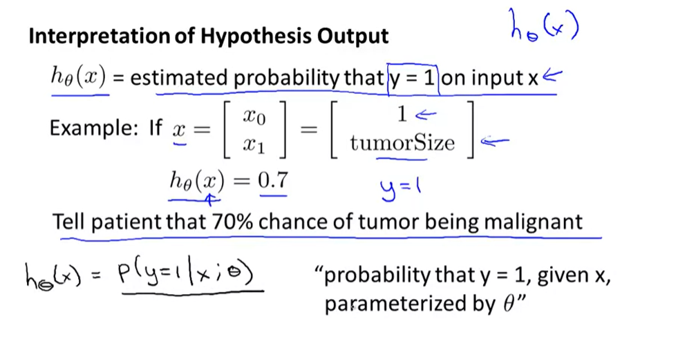 here's how I read this expression. This is the probability that y is equal to one. Given x, given that my patient has features x, so given my patient has a particular tumor size represented by my features x. And this probability is parameterized by theta. So I'm basically going to count on my hypothesis to give me estimates of the probability that y is equal to 1.