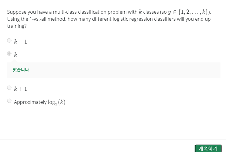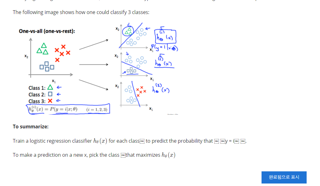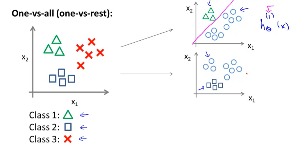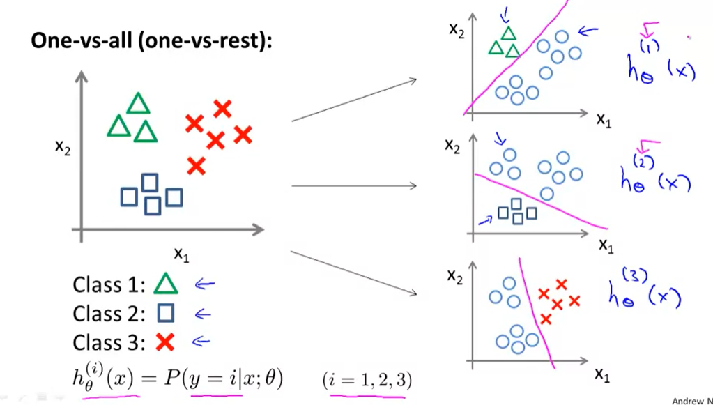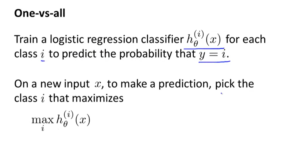 We are basically choosing one class and then lumping all the others into a single second class. We do this repeatedly, applying binary logistic regression to each case, and then use the hypothesis that returned the highest value as our prediction.